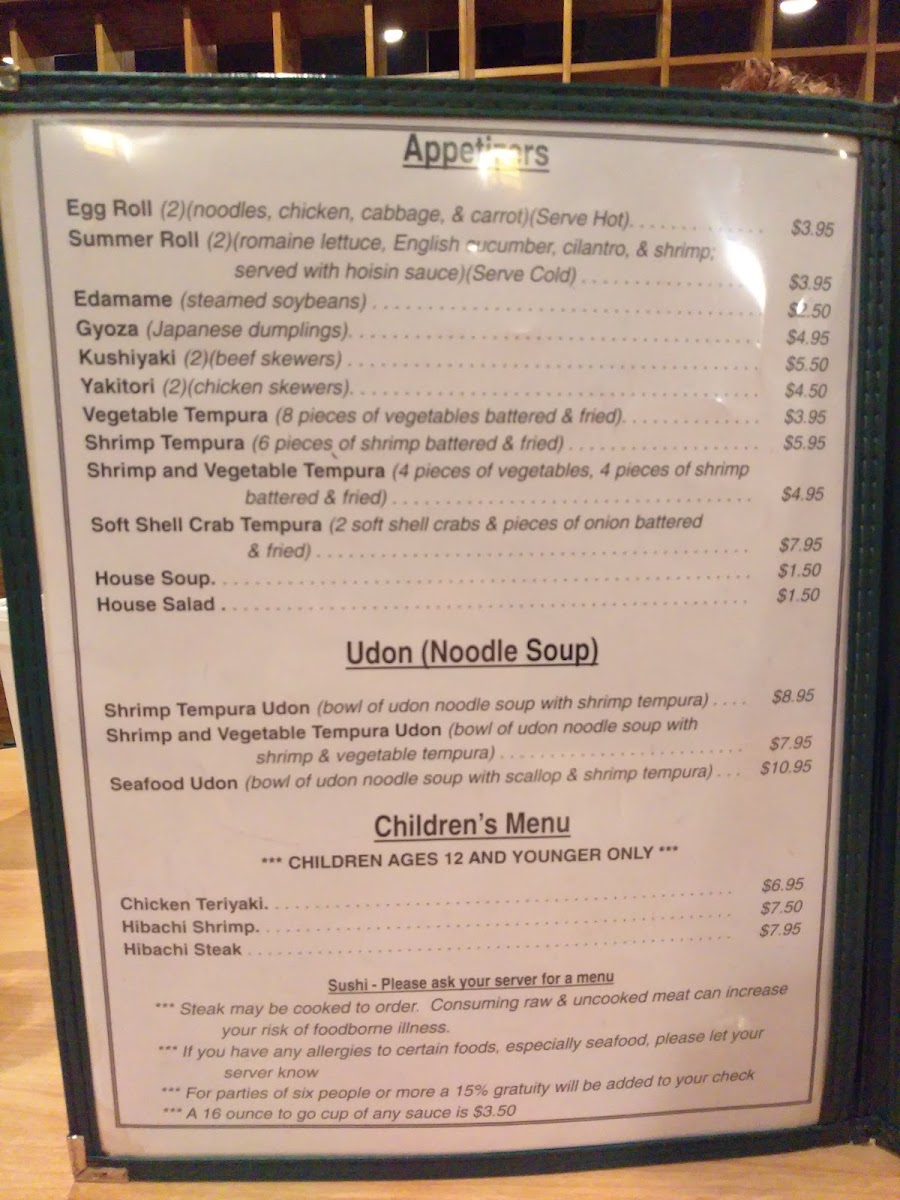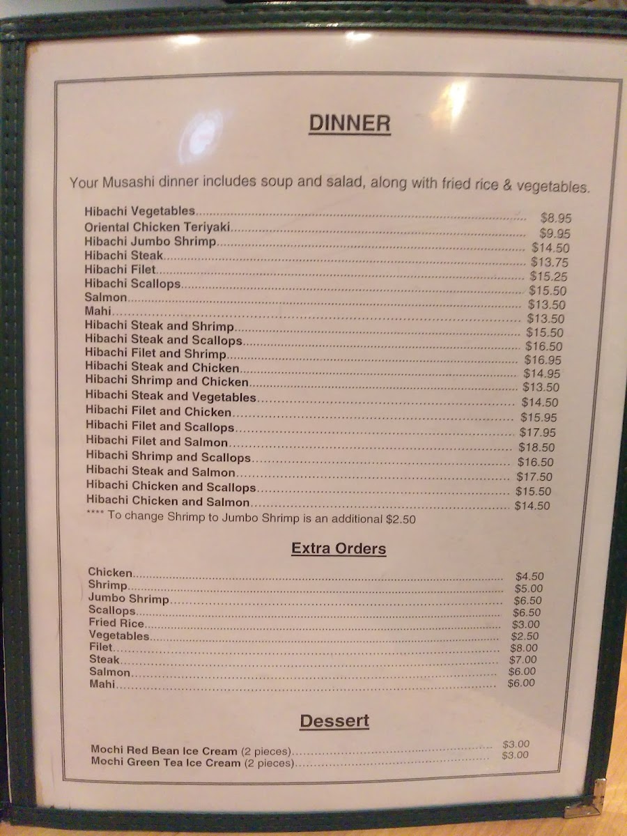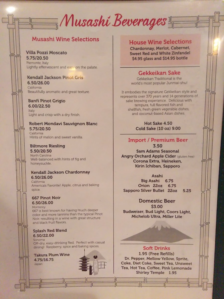 Start your meal with appetizers like the tender gyoza or crispy tempura, and move on to the main event with juicy steaks or succulent shrimp and scallops, all cooked right before your eyes. If you’re a fan of sushi, Musashi also offers a selection of rolls that will make your taste buds dance. And don't forget to pair your meal with a refreshing drink, from cocktails to teas, for the perfect touch. Whether you're here for a special occasion or just a casual dinner, Musashi Japanese Steak-Seafood Menu has a variety of options that are sure to impress.